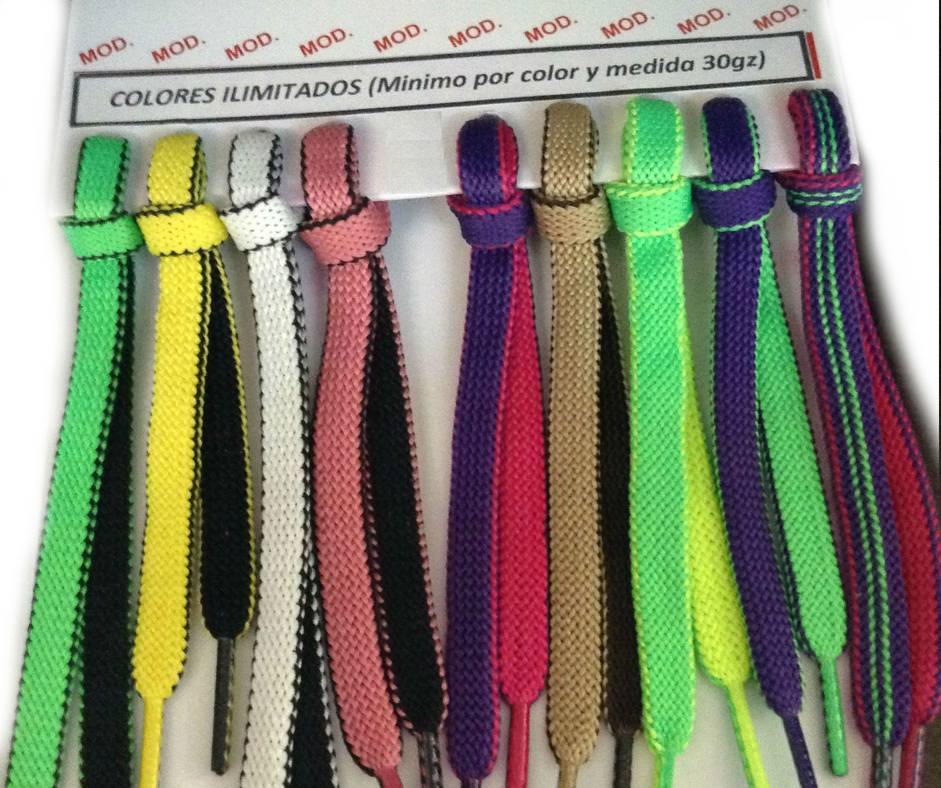 Nos dedicamos a la fabricación de agujetas con gran calidad en producción, contamos con diversas medidas de largo desde 35 cm hasta 2.20 mts de largo,ya sea cordones redondos en diferentes diámetros, cintas y agujetas planas en diferentes colores y combinaciones, además de colores especiales, totalmente hechos a tus necesidades.